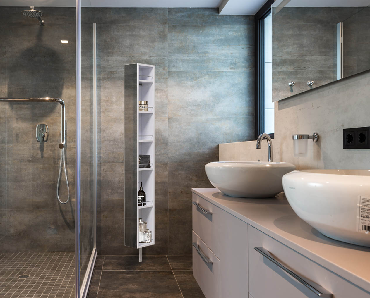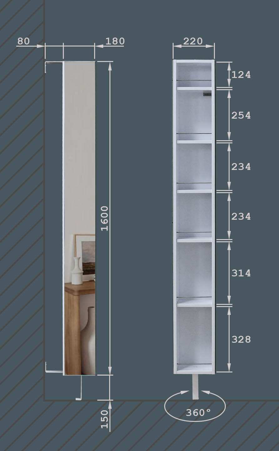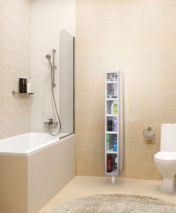 Большое зеркало на фасаде и узкие зеркала по бокам. За ними скрываются 6 глубоких полок с декоративными барьерами из нержавеющей стали. Полки сделаны разной высоты - от 12 до 33 см, что позволяет разместить самые разные предметы. Вита изготовлен из влагостойкого ЛДСП белого цвета и отлично подходит для ванной комнаты. Также вы можете заказать любой нужный вам цвет.