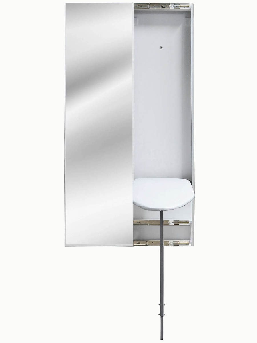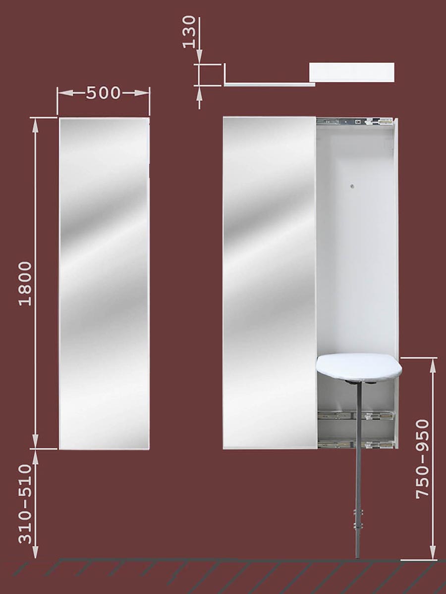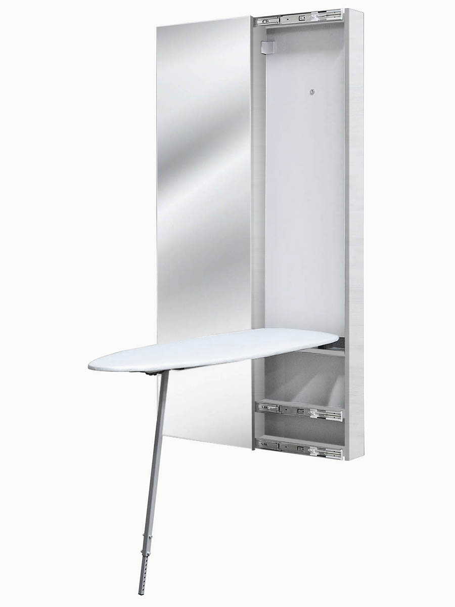 Айрон Бокс - шкаф со встроенной гладильной доской и удобными полками для хранения утюга и других гладильных принадлежностей. Фасад - большое зеркало в полный рост, размер 50*180 см.