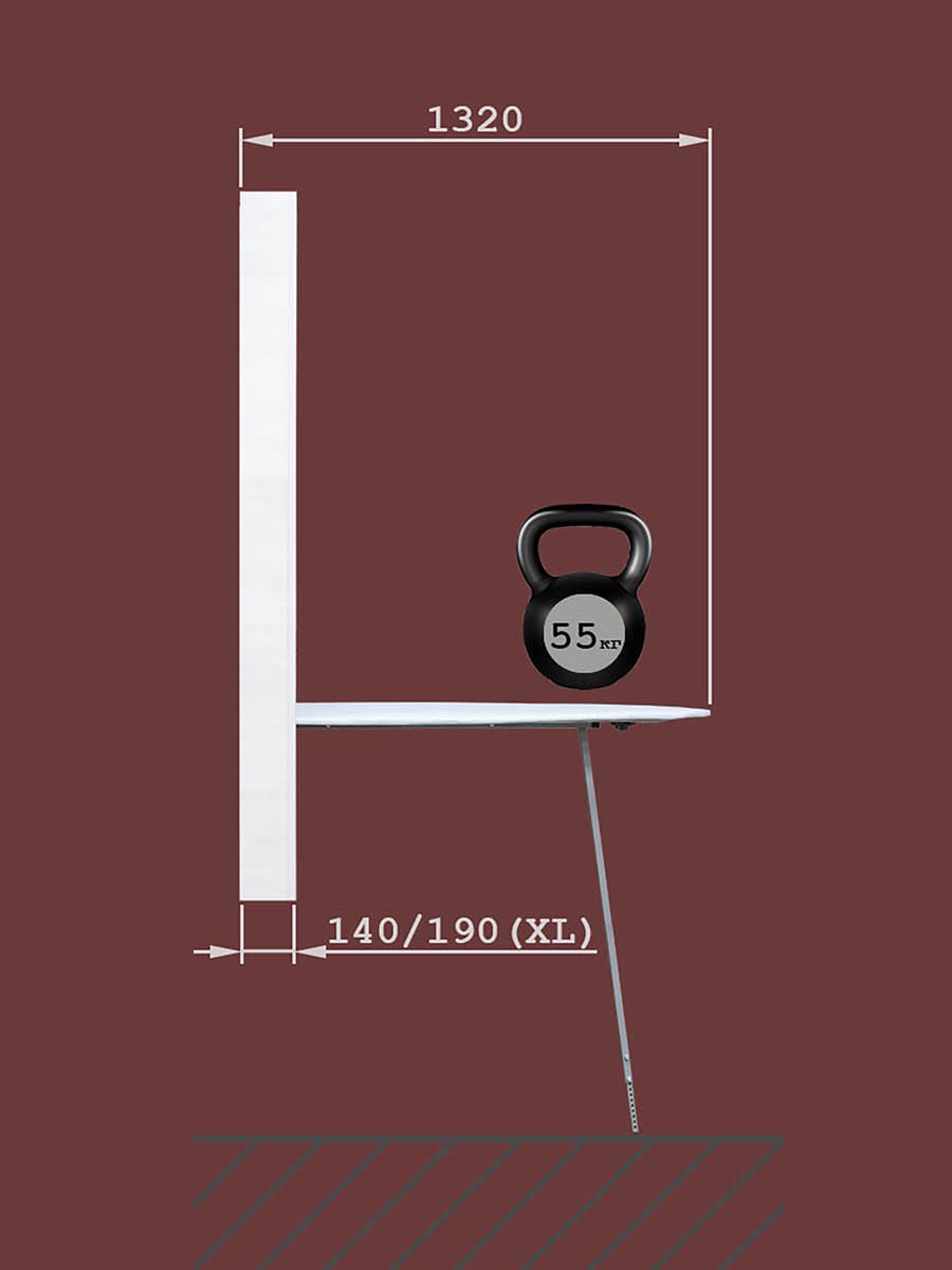 Широкая гладильная доска 122х40 см выполнена из перфорированного металла крепится к стене на мощном кронштейне. С другой стороны, устойчивость придает нога, опирающаяся на пол под тупым углом.